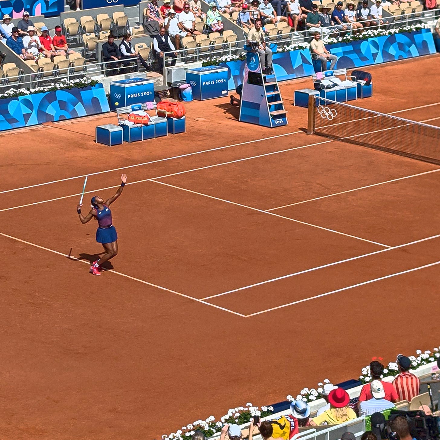 My seat is in the Philippe Chatrier court and as I take my place it occurs to me that I have no idea who is playing. When I bought the ticket it only said Men’s Singles or Women’s Singles and ‘subject to change’. Anyone playing at this level would be worthy of watching, but I’m more than happy when the young American starlet Coco Gauff waltzes out onto the court.