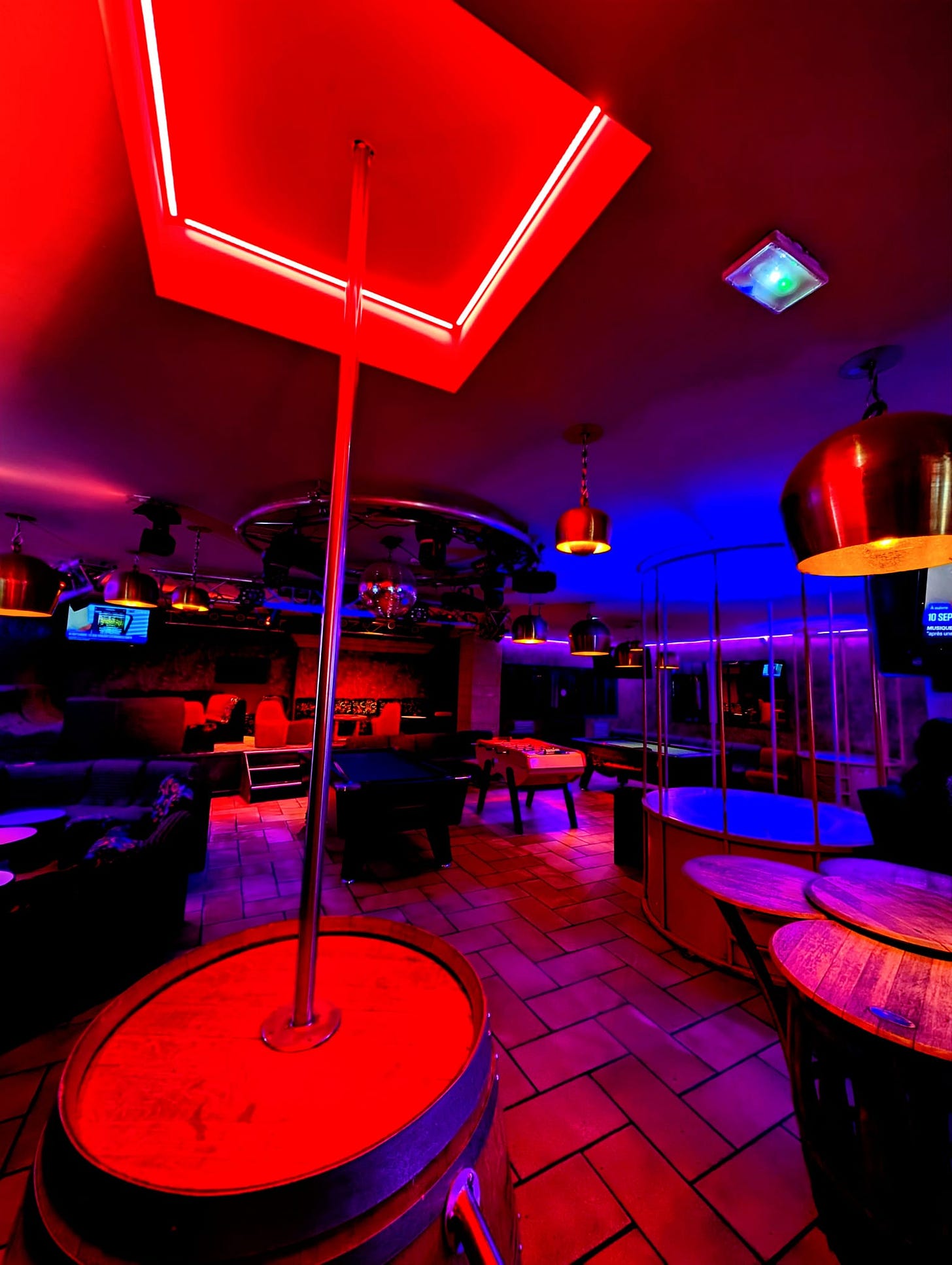 After eating, the landlady suggested we head to the Hotel bar next door, where the vibe would be a little different. She wasn’t wrong about that. The place looked like a strip club designed by David Lynch. Aside from the pole dancing booth next to the darts board, there was an inexplicable Loony Toons conveyor belt device that was carrying upside down wine glasses across the ceiling. We stayed for a while, hoping that someone might attempt a striptease but the rain outside was getting heavier and our ride home looked more precarious by the minute.